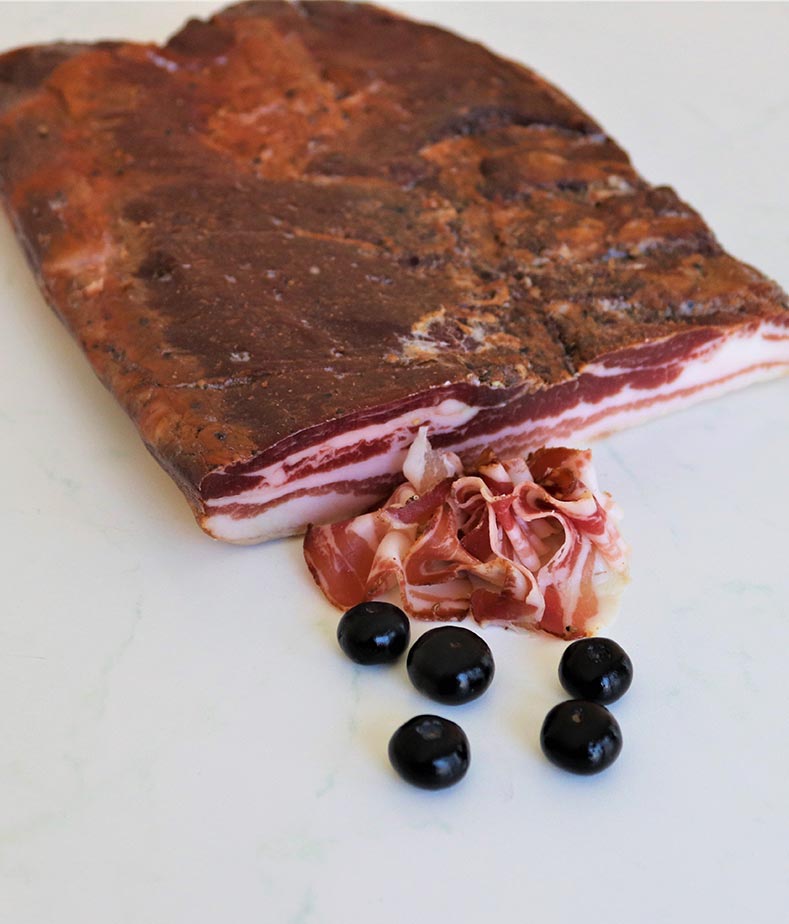Gleichmäßig durchzogen und intensiv geräuchert.